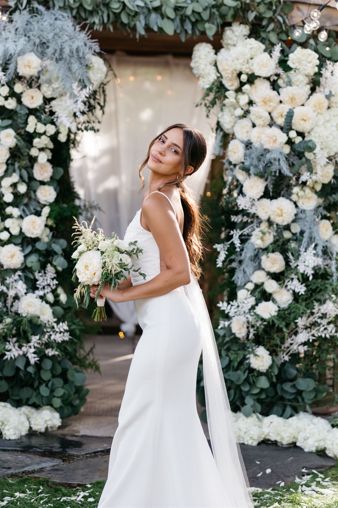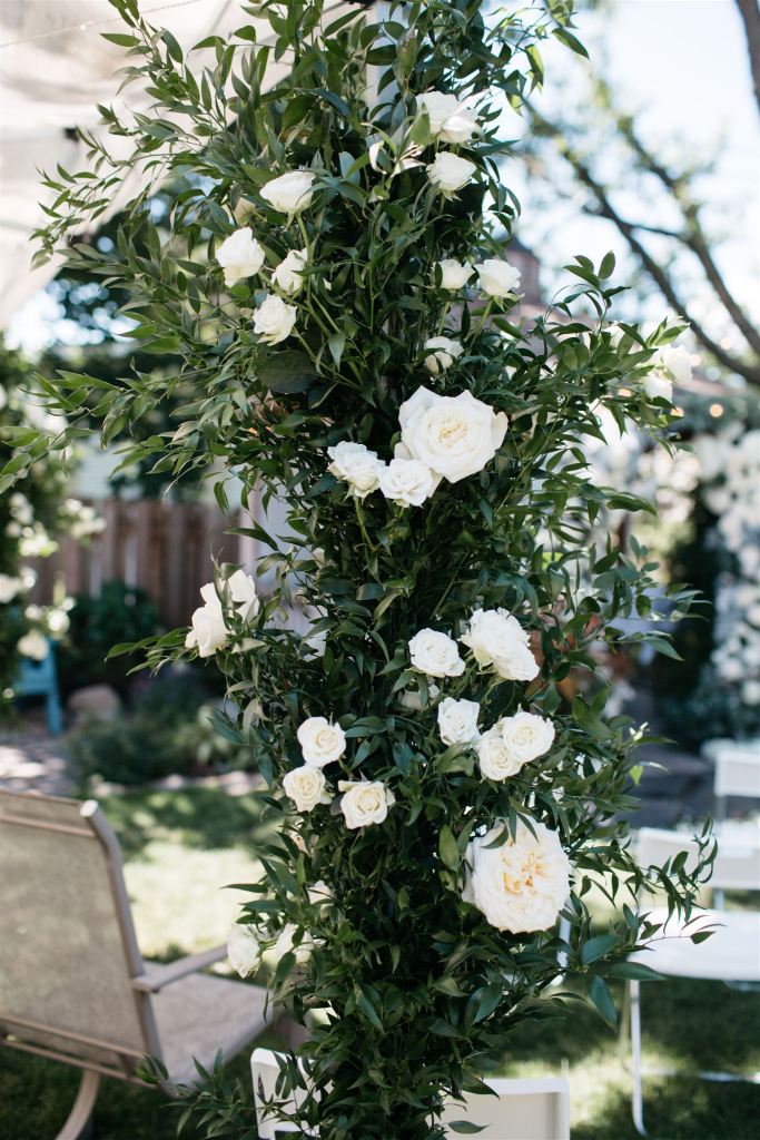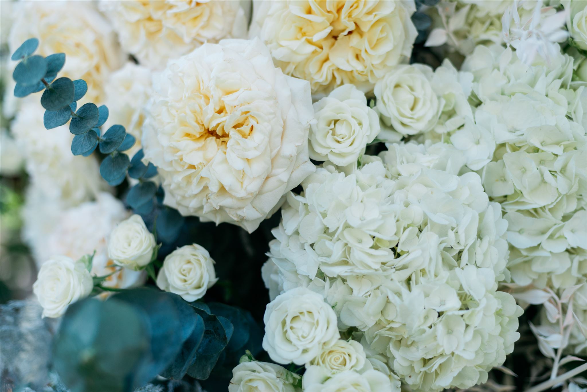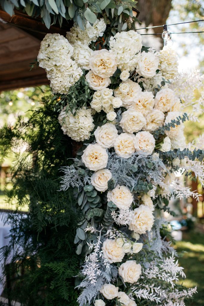 The pièce de résistance for the event (aside from Zofia of course) by far was the ceremonial arch, although the cedar hedge was no small feat either. This piece was truly a labor of love. The base of the arch was made up of curly willow that I weaved together by hand, while creating key junction points to place the main focal floral pieces. The structure was further enforced with seeded eucalyptus and magnolia and from there inspiration just took off, and this 4 ft long ceremonial masterpiece was created. This piece served multi functions for the bride and groom, in that after the ceremony it was used as the floral runner of their sweet heart table.
