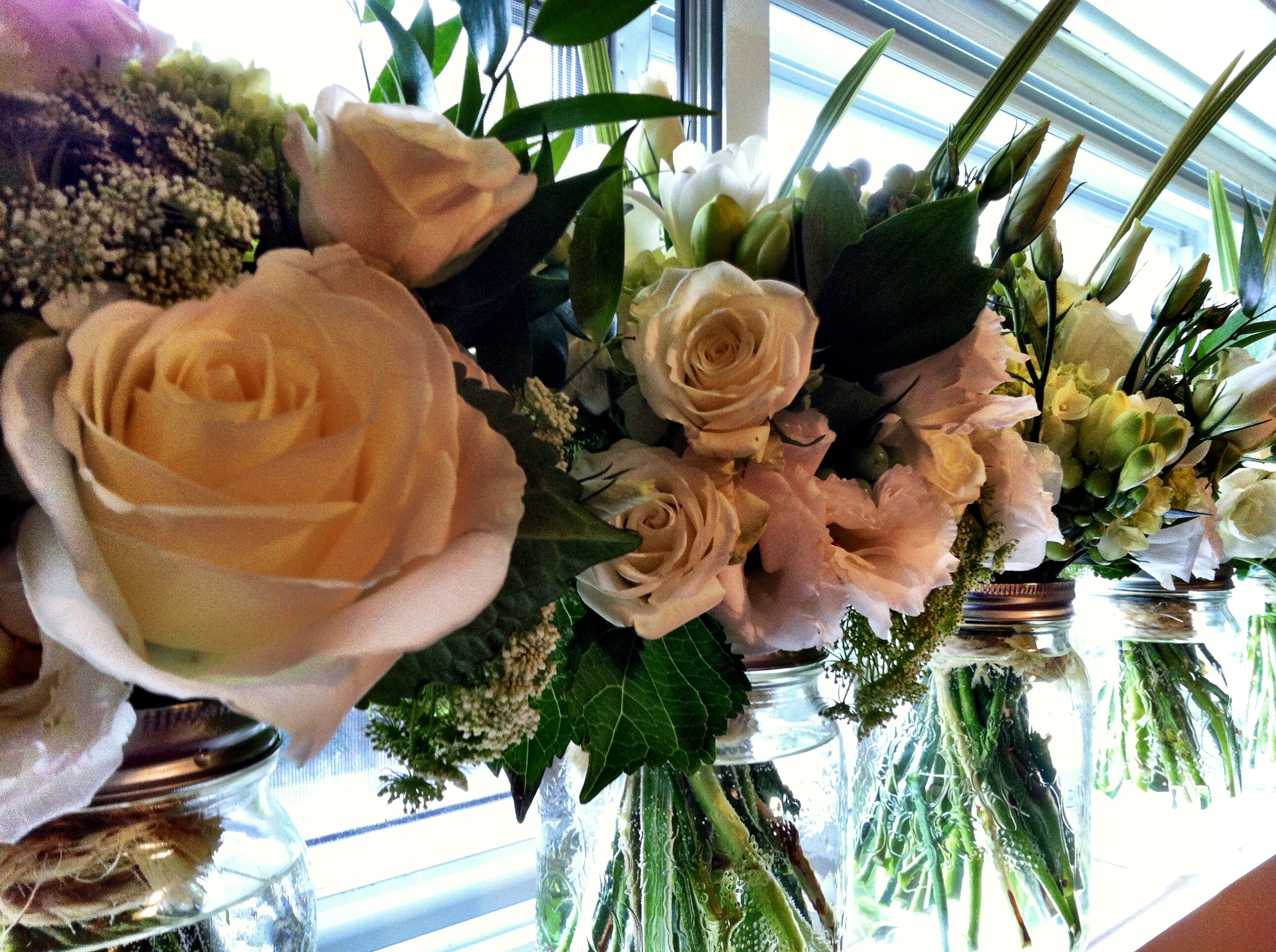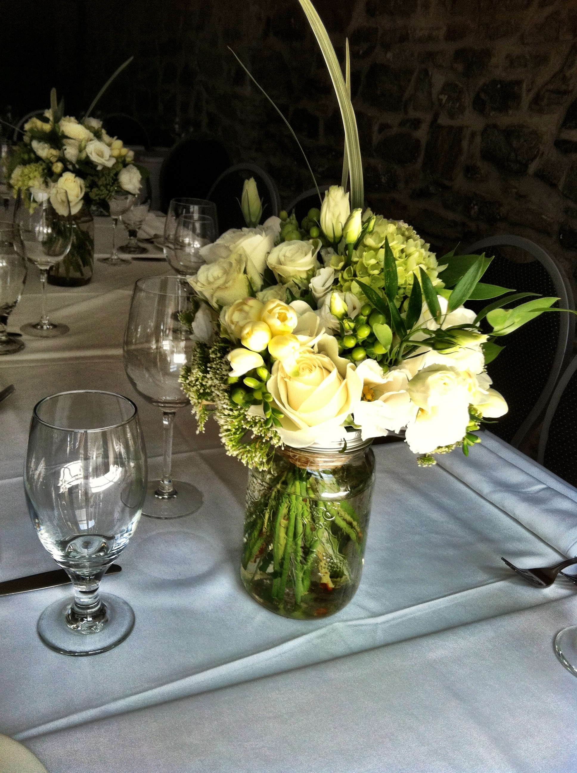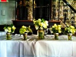 Cynthia and Kosta were a wonderful couple to work with. They were married on a beautiful day in May, and held their reception at the Vieux Port Steakhouse in Old Montreal. With Large Windows framed in black, and exposed brick walls, the Bride and Groom wanted a rustic yet classical look. Keeping the colours in a pure white with accents of greens, and using mason jars instead of a classic glass vase, the flowers warmed up the room instantly when placed on the tables.