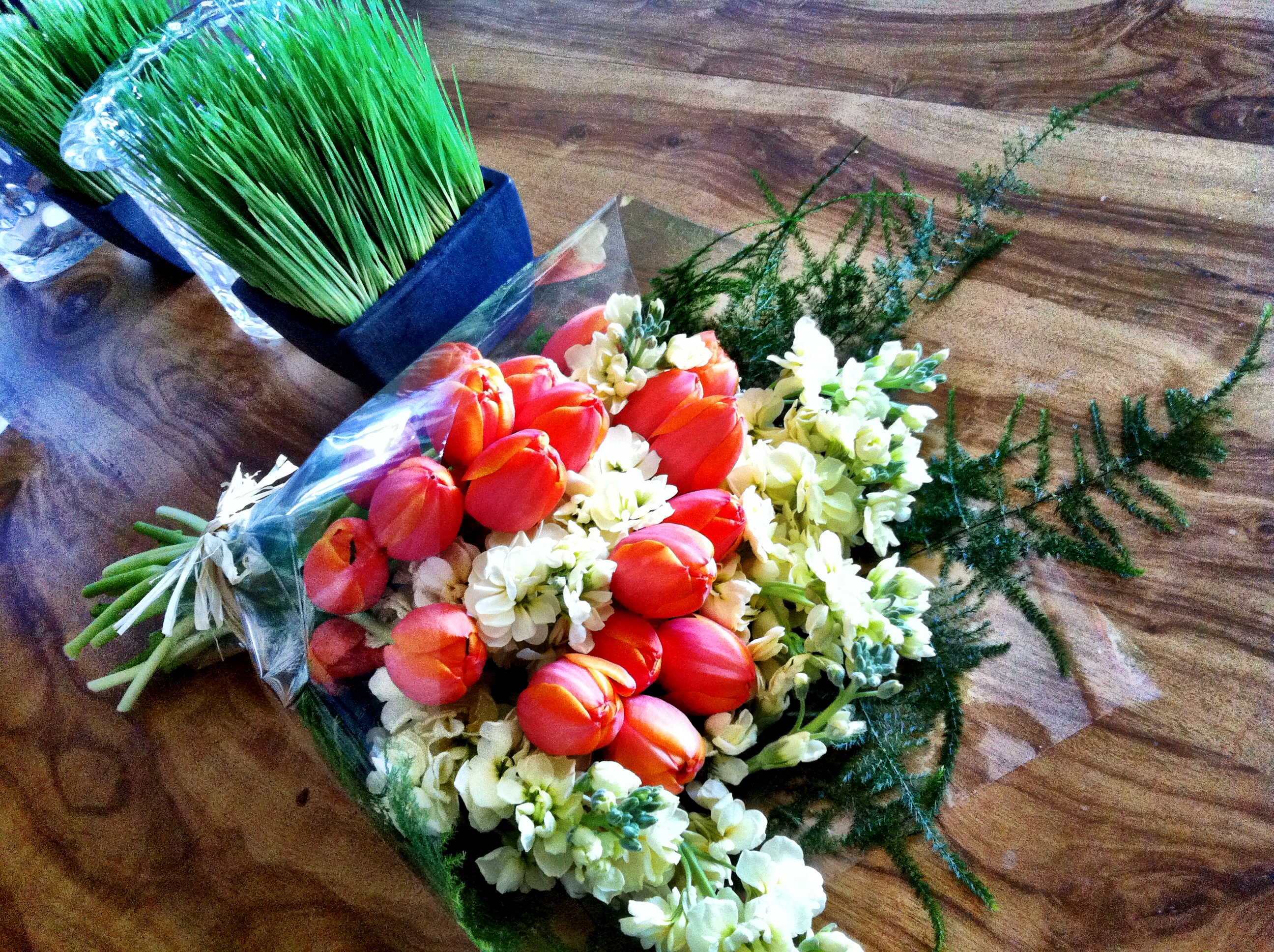 Here is a sample of one of the bouquets that went out this morning. The vibrant orange tulips, soft asparagus fern, and creamy yellow double stock will start off your morning in the right way.