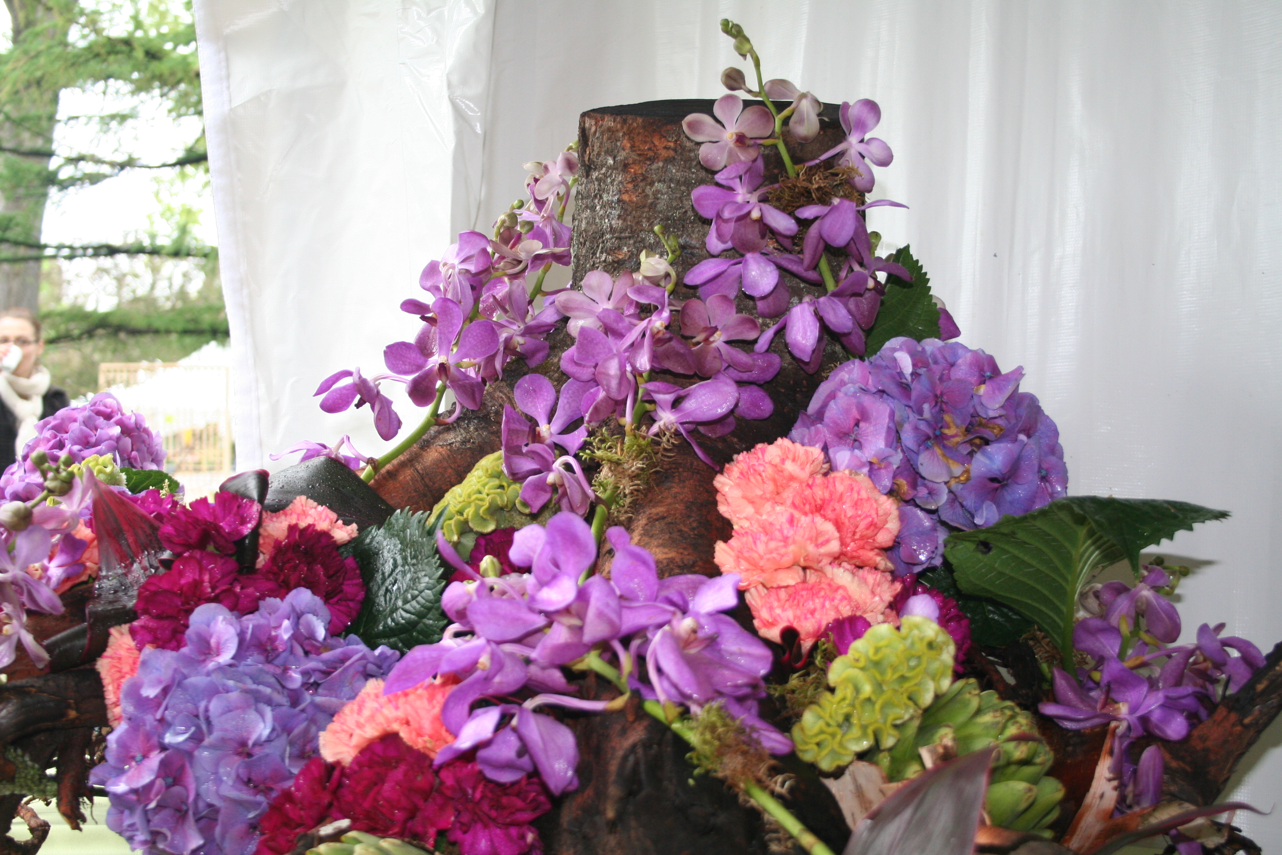 My Friend Genvieve Blais and I worked as a team on the project and here was the beginning of our idea, a tree stump that was so nicely dragged all the way from Ontario. With a lot of love, we removed all the superficial roots keeping only the major branches and root systems, scrubbed, hosed, and once dried busted out the blow torch. Much to our delight we noticed while blowtorching on my driveway, and getting some rather odd looks from my neighbors, that the wood was becoming more and more red, with a slightly glazed appearance. The theme of the project was Renaissance, or the Re-birth. The idea was that even after a natural disaster event, such as a forest fire, that nature will always find a way to start over. We wanted to keep the flowers bright and colourful to maintain a strong contrast with the trunk, and with regards to the food aspect we chose artichokes to represent new blooms.